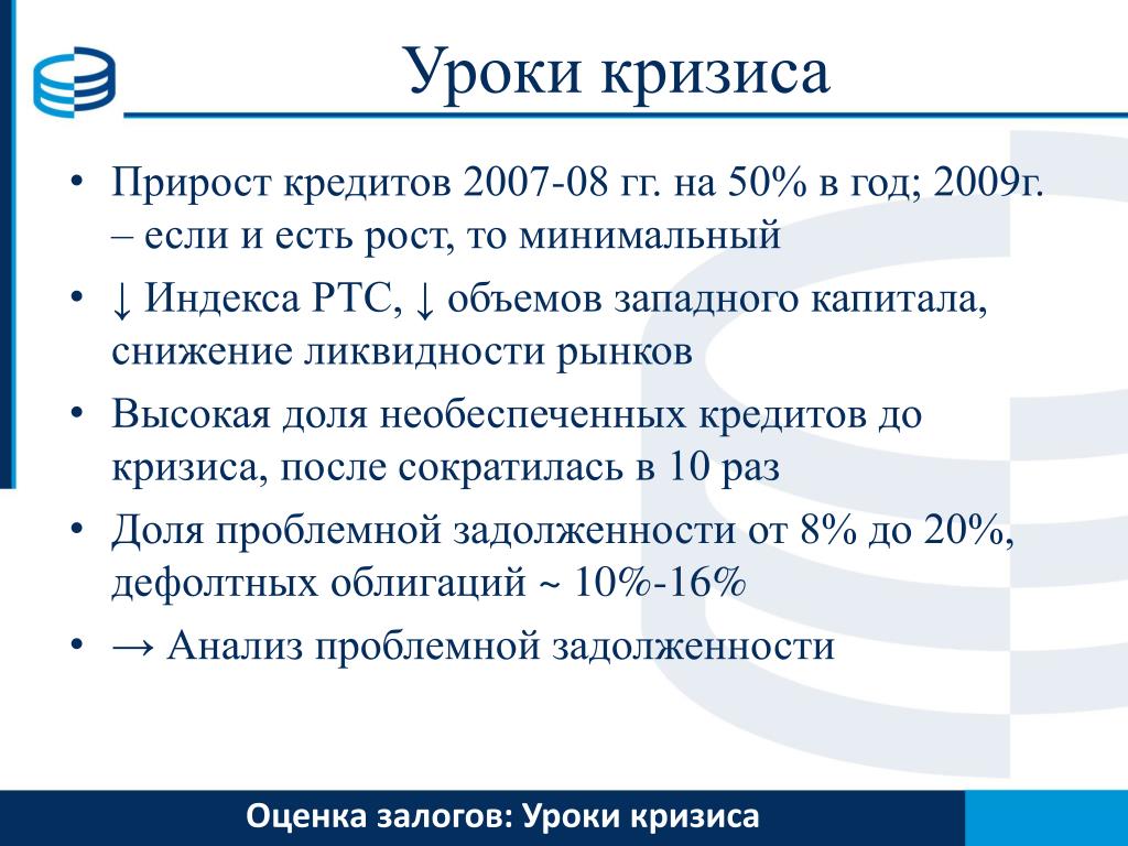 Уроки кризиса • Прирост кредитов 2007-08 гг. на 50% в год; 2009г. – если и есть рост, то минимальный • ↓ Индекса РТС, ↓ объемов западного капитала, снижение ликвидности рынков • Высокая доля необеспеченных кредитов до кризиса, после сократилась в 10 раз • Доля проблемной задолженности от 8% до 20%, дефолтных облигаций ~ 10%-16% • → Анализ проблемной задолженности Оценка залогов:Уроки кризиса