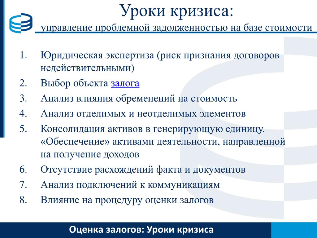 Уроки кризиса:управление проблемной задолженностью на базе стоимости • Юридическая экспертиза (риск признания договоров недействительными) • Выбор объекта залога • Анализ влияния обременений на стоимость • Анализ отделимых и неотделимых элементов • Консолидация активов в генерирующую единицу. «Обеспечение» активами деятельности, направленной на получение доходов • Отсутствие расхождений факта и документов • Анализ подключений к коммуникациям • Влияние на процедуру оценки залогов Оценка залогов:Уроки кризиса