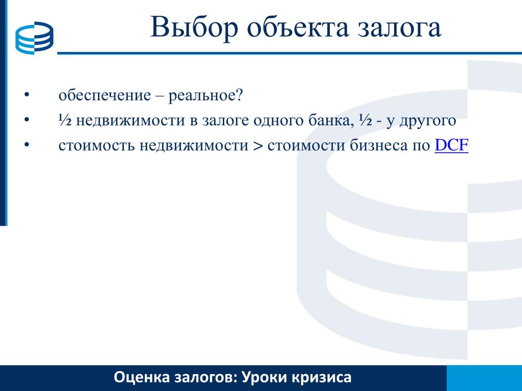 Выбор объекта залога • обеспечение – реальное? • ½ недвижимости в залоге одного банка, ½ - удругого • стоимость недвижимости > стоимости бизнеса по DCF Оценка залогов:Уроки кризиса