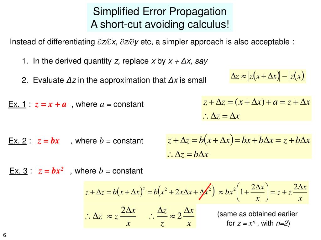 Simplified Error Propagation A short-cut avoiding calculus! Instead of differentiating z/x, z/y etc, a simpler approach is also acceptable : 1. In the derived quantity z, replace x by x +Δx, say 2. Evaluate Δz in the approximation that Δx is small Ex. 1 : z = x + a , where a = constant Ex. 2 : z = bx , where b = constant Ex. 3 : z = bx2 , where b = constant (same as obtained earlier for z = xn , with n=2) 6