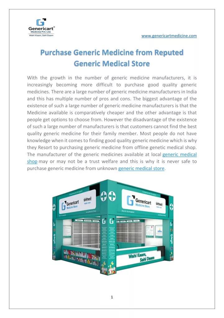 www.genericartmedicine.com Purchase Generic Medicine from Reputed Generic Medical Store With the growth in the number of generic medicine manufacturers, it is increasingly becoming more difficult to purchase good quality generic medicines. There are a large number of generic medicine manufacturers in India and this has multiple number of pros and cons. The biggest advantage of the existence of such a large number of generic medicine manufacturers is that the Medicine available is comparatively cheaper and the other advantage is that people get options to choose from. However the disadvantage of the existence of such a large number of manufacturers is that customers cannot find the best quality generic medicine for their family member. Most people do not have knowledge when it comes to finding good quality generic medicine which is why they Resort to purchasing generic medicine from offline genetic medical shop. The manufacturer of the generic medicines available at local generic medical shop may or may not be a trust welfare and this is why it is never safe to purchase generic medicine from unknown generic medical store. 1