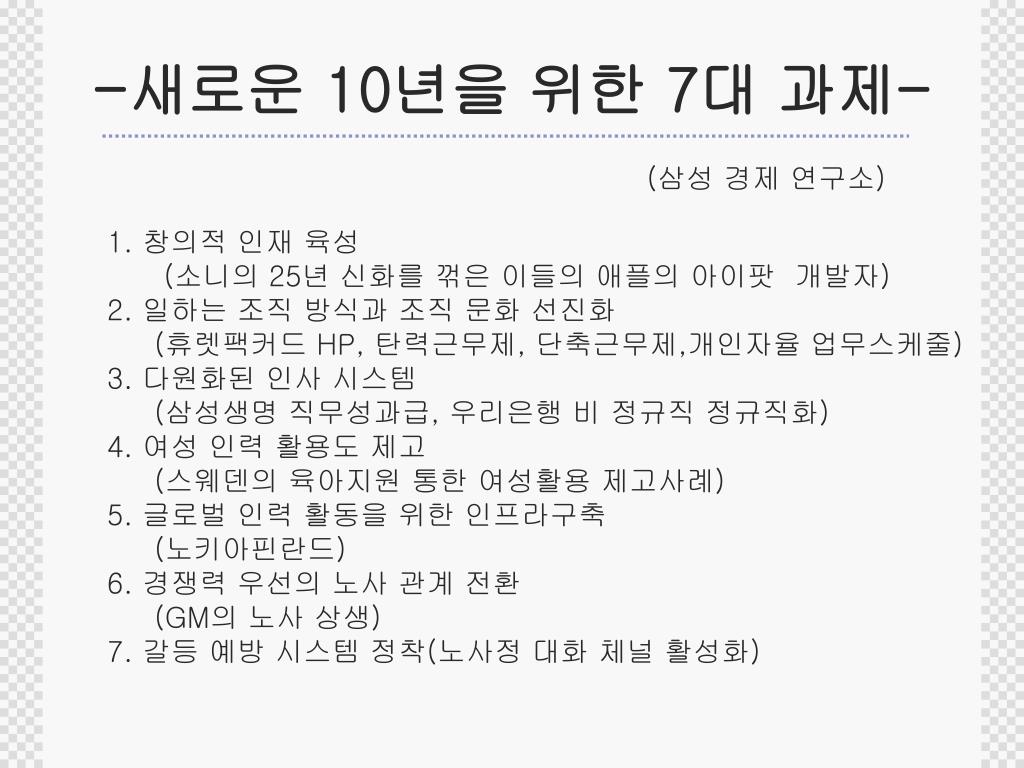 -새로운 10년을 위한 7대 과제- (삼성 경제 연구소) 1. 창의적 인재 육성 (소니의 25년 신화를 꺾은 이들의 애플의 아이팟 개발자) 2. 일하는 조직 방식과 조직 문화 선진화 (휴렛팩커드 HP, 탄력근무제, 단축근무제,개인자율 업무스케줄) 3. 다원화된 인사 시스템 (삼성생명 직무성과급, 우리은행 비 정규직 정규직화) 4. 여성 인력 활용도 제고 (스웨덴의 육아지원 통한 여성활용 제고사례) 5. 글로벌 인력 활동을 위한 인프라구축 (노키아핀란드) 6. 경쟁력 우선의 노사 관계 전환 (GM의 노사 상생) 7. 갈등 예방 시스템 정착(노사정 대화 체널 활성화)
