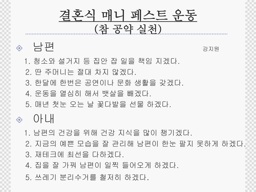 결혼식 매니 페스트 운동(참 공약 실천) • 남편 강지원 1. 청소와 설거지 등 집안 잡 일을 책임 지겠다. 2. 딴 주머니는 절대 차지 않겠다. 3. 한달에 한번은 공연이나 문화 생활을 갖겠다. 4. 운동을 열심히 해서 뱃살을 빼겠다. 5. 매년 첫눈 오는 날 꽃다발을 선물 하겠다. • 아내 1. 남편의 건강을 위해 건강 지식을 많이 챙기겠다. 2. 지금의 예쁜 모습을 잘 관리해 남편이 한눈 팔지 못하게 하겠다. 3. 재테크에 최선을 다하겠다. 4. 집을 잘 가꿔 남편이 일찍 들어오게 하겠다. 5. 쓰레기 분리수거를 철저히 하겠다.