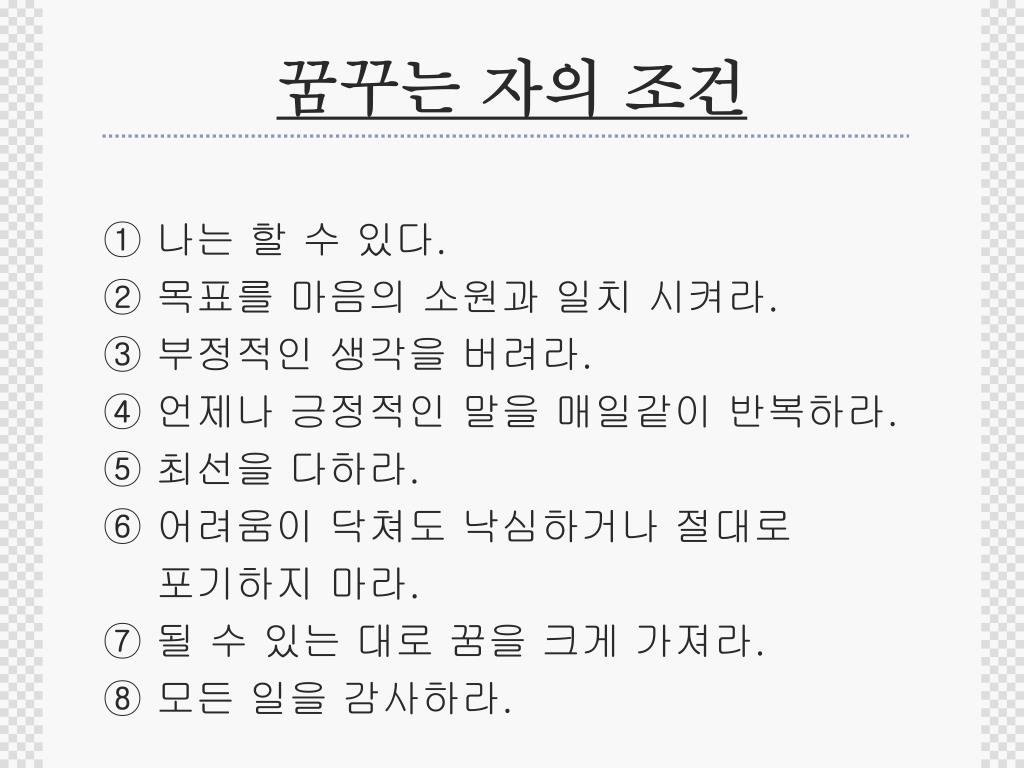 꿈꾸는 자의 조건 ① 나는 할 수 있다. ② 목표를 마음의 소원과 일치 시켜라. ③ 부정적인 생각을 버려라. ④ 언제나 긍정적인 말을 매일같이 반복하라. ⑤ 최선을 다하라. ⑥ 어려움이 닥쳐도 낙심하거나 절대로 포기하지 마라. ⑦ 될 수 있는 대로 꿈을 크게 가져라. ⑧ 모든 일을 감사하라.