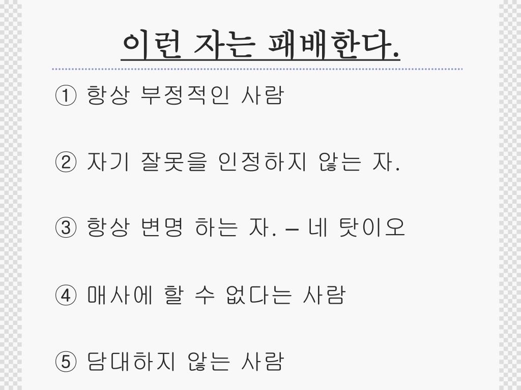 이런 자는 패배한다. ① 항상 부정적인 사람 ② 자기 잘못을 인정하지 않는 자. ③ 항상 변명 하는 자. –네 탓이오 ④ 매사에 할 수 없다는 사람 ⑤ 담대하지 않는 사람