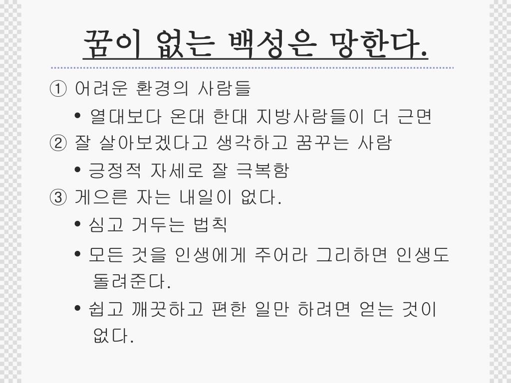 꿈이 없는 백성은 망한다. ① 어려운 환경의 사람들 •열대보다 온대 한대 지방사람들이 더 근면 ② 잘 살아보겠다고 생각하고 꿈꾸는 사람 •긍정적 자세로 잘 극복함 ③ 게으른 자는 내일이 없다. •심고 거두는 법칙 •모든 것을 인생에게 주어라 그리하면 인생도 돌려준다. •쉽고 깨끗하고 편한 일만 하려면 얻는 것이 없다.
