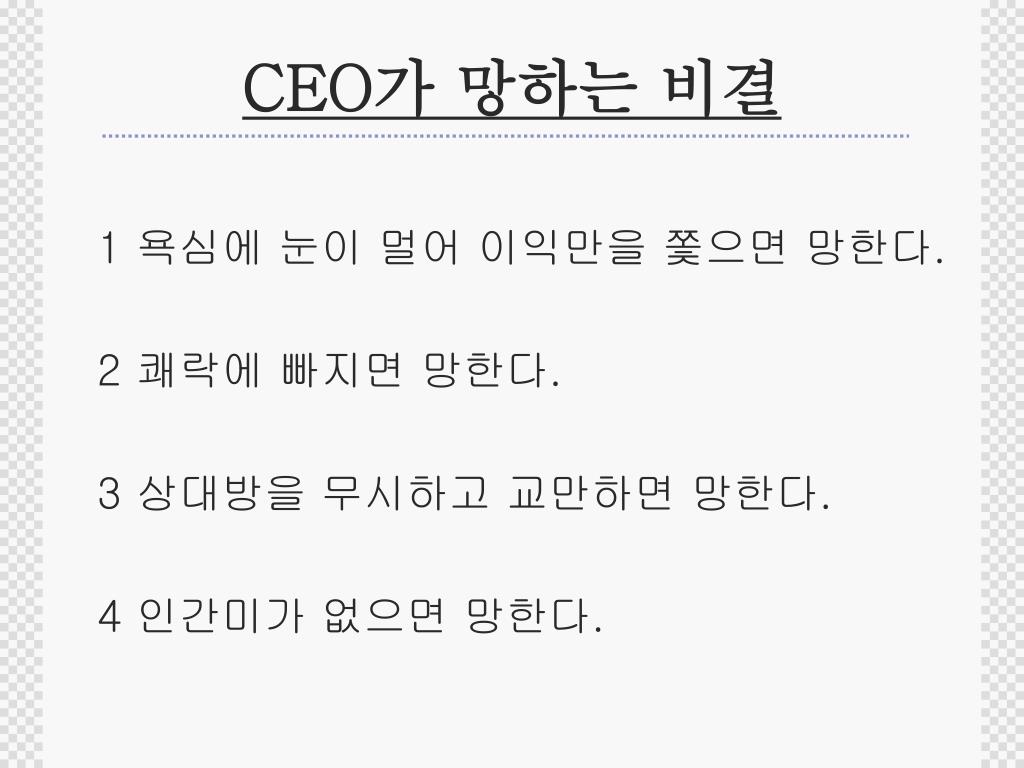 CEO가 망하는 비결 1 욕심에 눈이 멀어 이익만을 쫓으면 망한다. 2 쾌락에 빠지면 망한다. 3 상대방을 무시하고 교만하면 망한다. 4 인간미가 없으면 망한다.