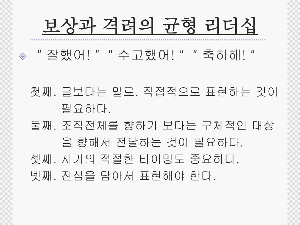 보상과 격려의 균형 리더십 • "잘했어!""수고했어!""축하해!" 첫째. 글보다는 말로. 직접적으로 표현하는 것이 필요하다. 둘째. 조직전체를 향하기 보다는 구체적인 대상 을 향해서 전달하는 것이 필요하다. 셋째. 시기의 적절한 타이밍도 중요하다. 넷째. 진심을 담아서 표현해야 한다.