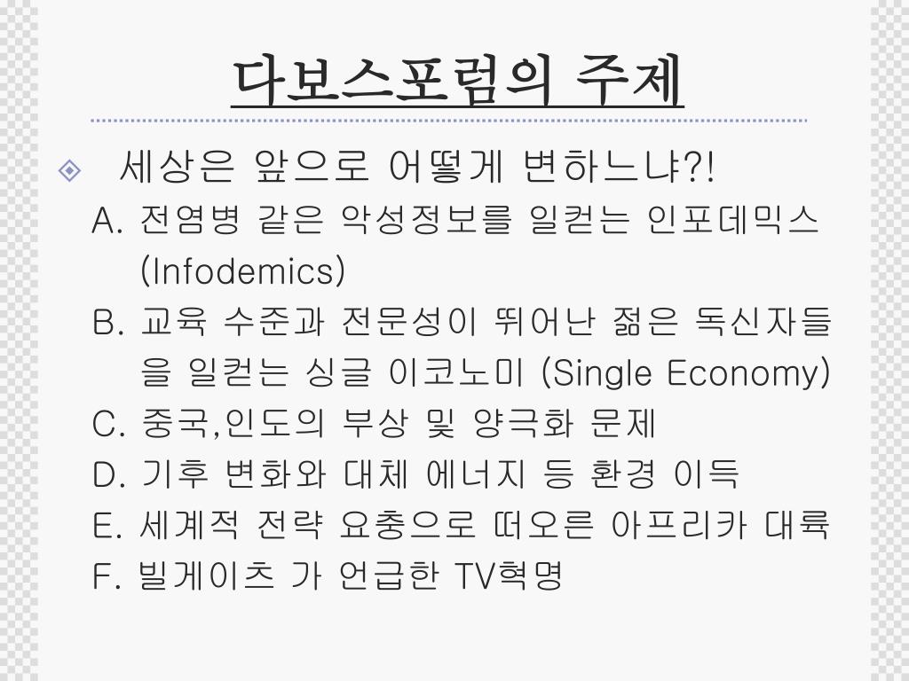 다보스포럼의 주제 • 세상은 앞으로 어떻게 변하느냐?! A. 전염병 같은 악성정보를 일컫는 인포데믹스 (Infodemics) B. 교육 수준과 전문성이 뛰어난 젊은 독신자들 을 일컫는 싱글 이코노미 (Single Economy) C. 중국,인도의 부상 및 양극화 문제 D. 기후 변화와 대체 에너지 등 환경 이득 E. 세계적 전략 요충으로 떠오른 아프리카 대륙 F. 빌게이츠 가 언급한 TV혁명