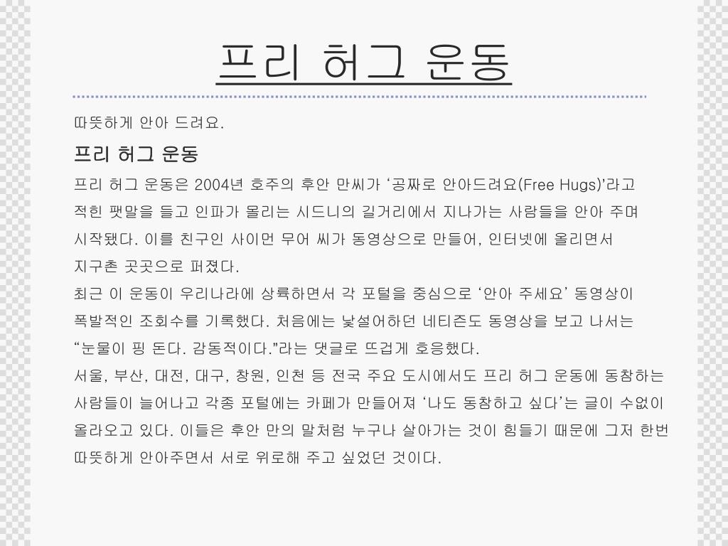 프리 허그 운동 따뜻하게 안아 드려요. 프리 허그 운동 프리 허그 운동은 2004년 호주의 후안 만씨가 ‘공짜로 안아드려요(Free Hugs)’라고 적힌 팻말을 들고 인파가 몰리는 시드니의 길거리에서 지나가는 사람들을 안아 주며 시작됐다. 이를 친구인 사이먼 무어 씨가 동영상으로 만들어, 인터넷에 올리면서 지구촌 곳곳으로 퍼졌다. 최근 이 운동이 우리나라에 상륙하면서 각 포털을 중심으로 ‘안아 주세요’ 동영상이 폭발적인 조회수를 기록했다. 처음에는 낯설어하던 네티즌도 동영상을 보고 나서는 “눈물이 핑 돈다. 감동적이다.”라는 댓글로 뜨겁게 호응했다. 서울, 부산, 대전, 대구, 창원, 인천 등 전국 주요 도시에서도 프리 허그 운동에 동참하는 사람들이 늘어나고 각종 포털에는 카페가 만들어져 ‘나도 동참하고 싶다’는 글이 수없이 올라오고 있다. 이들은 후안 만의 말처럼 누구나 살아가는 것이 힘들기 때문에 그저 한번 따뜻하게 안아주면서 서로 위로해 주고 싶었던 것이다.