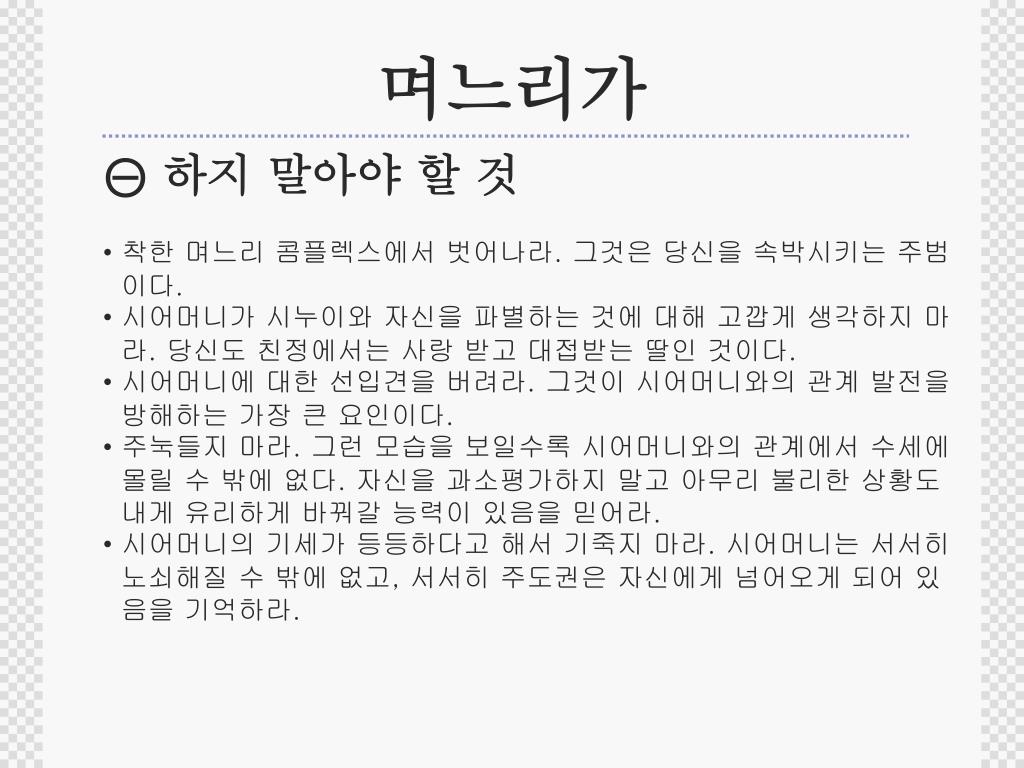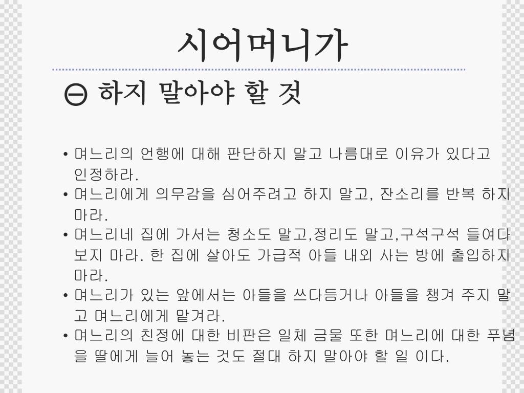 ⊝ 하지 말아야 할 것 •며느리의 언행에 대해 판단하지 말고 나름대로 이유가 있다고 인정하라. •며느리에게 의무감을 심어주려고 하지 말고, 잔소리를 반복 하지 마라. •며느리네 집에 가서는 청소도 말고,정리도 말고,구석구석 들여다 보지 마라. 한 집에 살아도 가급적 아들 내외 사는 방에 출입하지 마라. •며느리가 있는 앞에서는 아들을 쓰다듬거나 아들을 챙겨 주지 말 고 며느리에게 맡겨라. •며느리의 친정에 대한 비판은 일체 금물 또한 며느리에 대한 푸념 을 딸에게 늘어 놓는 것도 절대 하지 말아야 할 일 이다. 시어머니가