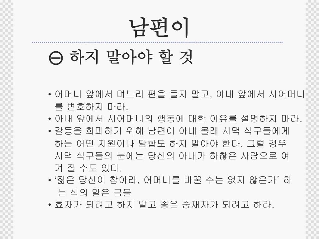 남편들이여, 효자가 아니라 좋은 중재자가 되어라. ⊕ 해야 할 것 •아내만큼 내가 적응하고 싸워야 하는 것이 많지 않음에 감사하라. 그리고 현실상 그래야 하는 아내에게 미안해 하고, 좋은 조력자가 되려고 노력 하라. •고부간의 갈등이 있는 상황이 현실이고 필연적인 것임을 인내심을 갖고 받아들여라. •아내가 이해 못하는 시댁의 분위기나 시댁 식구들의 행동에 대해 방어 하지 말고 한번쯤 객관적인 시각으로 돌아 보고 자신의 식구들에게도 흠과 단점이 있다는 것을 인정하라. •웃어른이라고 해서 항상 옳은 것은 아니며, 비합리적인 것에 대해서는 맞설 줄도 알아야 한다. •아내 앞에서는 아내 편을 , 어머니 앞에서는 어머니 편을 들어라. •새댁과의 갈등 상황 속에서도 아내에 대한 애정은 변화가 없음을 아내 로 하여금 알게 하라. 이것이 당신의 아내가 안정감과 여유를 갖게 도와 줄 것이다. •어머니를 행복하게 해 드리면 그것은 어머니에게 유익하지만, 아내를 행복하게 해주면 그것은 내 자녀들에게 두루 유익하다.