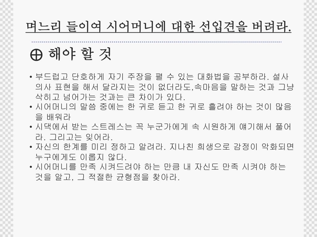 며느리 들이여 시어머니에 대한 선입견을 버려라. ⊕ 해야 할 것 •부드럽고 단호하게 자기 주장을 펼 수 있는 대화법을 공부하라. 설사 의사 표현을 해서 달라지는 것이 없더라도,속마음을 말하는 것과 그냥 삭히고 넘어가는 것과는 큰 차이가 있다. •시어머니의 말씀 중에는 한 귀로 듣고 한 귀로 흘려야 하는 것이 많음 을 배워라 •시댁에서 받는 스트레스는 꼭 누군가에게 속 시원하게 얘기해서 풀어 라. 그리고는 잊어라. •자신의 한계를 미리 정하고 알려라. 지나친 희생으로 감정이 악화되면 누구에게도 이롭지 않다. •시어머니를 만족 시켜드려야 하는 만큼 내 자신도 만족 시켜야 하는 것을 알고, 그 적절한 균형점을 찾아라.