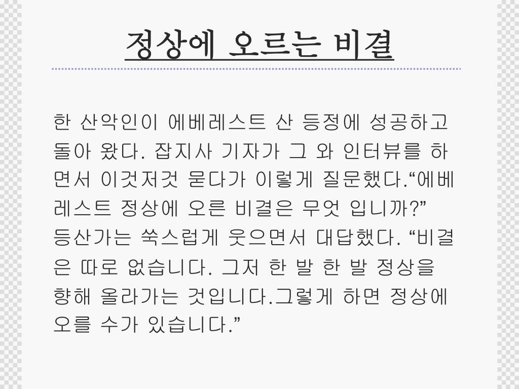 정상에 오르는 비결 한 산악인이 에베레스트 산 등정에 성공하고 돌아 왔다. 잡지사 기자가 그 와 인터뷰를 하 면서 이것저것 묻다가 이렇게 질문했다.“에베 레스트 정상에 오른 비결은 무엇 입니까?” 등산가는 쑥스럽게 웃으면서 대답했다. “비결 은 따로 없습니다. 그저 한 발 한 발 정상을 향해 올라가는 것입니다.그렇게 하면 정상에 오를 수가 있습니다.”