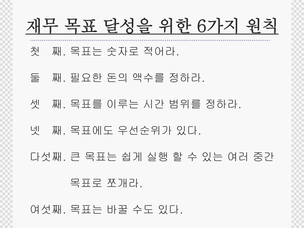 재무 목표 달성을 위한 6가지 원칙 첫 째. 목표는 숫자로 적어라. 둘 째. 필요한 돈의 액수를 정하라. 셋 째. 목표를 이루는 시간 범위를 정하라. 넷 째. 목표에도 우선순위가 있다. 다섯째. 큰 목표는 쉽게 실행 할 수 있는 여러 중간 목표로 쪼개라. 여섯째. 목표는 바꿀 수도 있다.