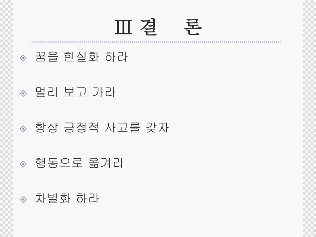 Ⅲ 결 론 • 꿈을 현실화 하라 • 멀리 보고 가라 • 항상 긍정적 사고를 갖자 • 행동으로 옮겨라 • 차별화 하라