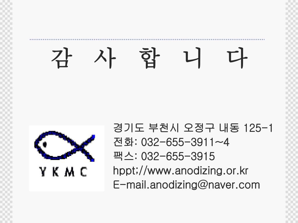 감 사 합 니 다 경기도 부천시 오정구 내동 125-1 전화: 032-655-3911~4 팩스: 032-655-3915 hppt;//www.anodizing.or.kr E-mail.anodizing@naver.com