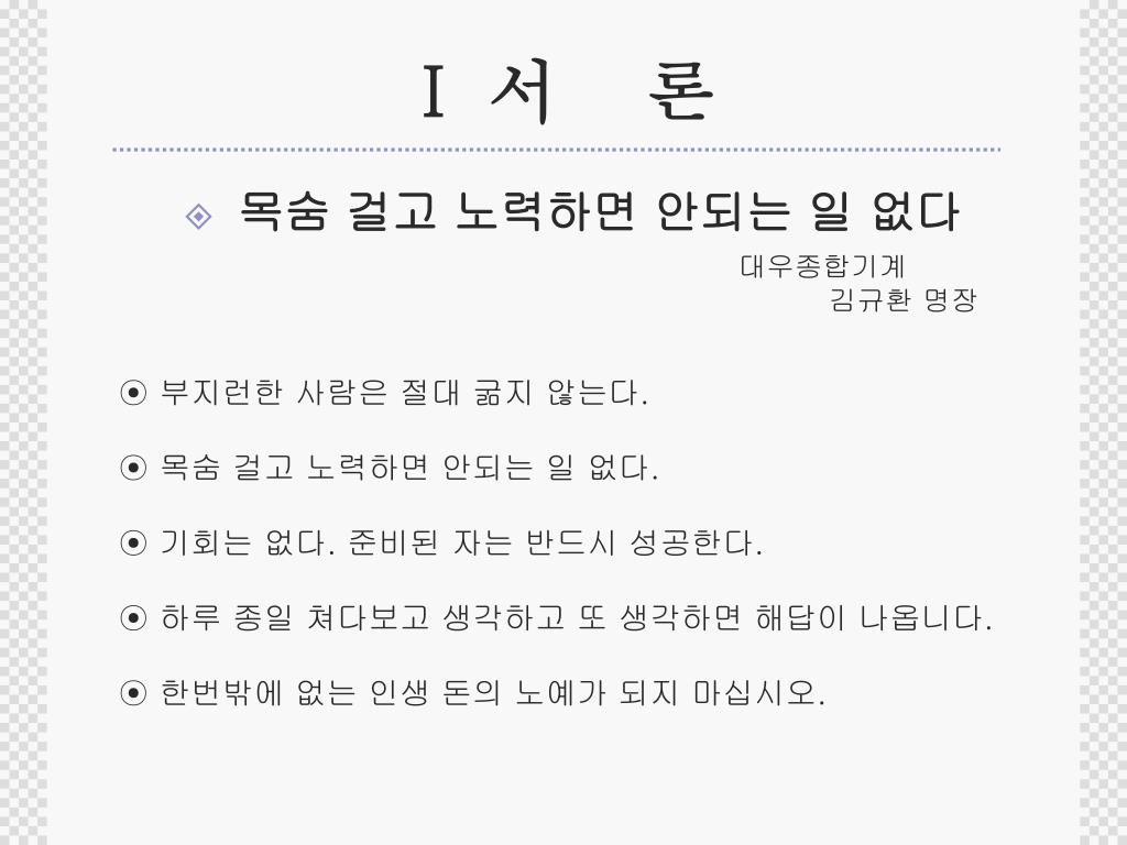 목숨 걸고 노력하면 안되는 일 없다 대우종합기계 김규환 명장 ⊙ 부지런한 사람은 절대 굶지 않는다. ⊙ 목숨 걸고 노력하면 안되는 일 없다. ⊙ 기회는 없다. 준비된 자는 반드시 성공한다. ⊙ 하루 종일 쳐다보고 생각하고 또 생각하면 해답이 나옵니다. ⊙ 한번밖에 없는 인생 돈의 노예가 되지 마십시오. I 서 론