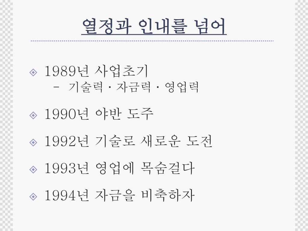 열정과 인내를 넘어 • 1989년 사업초기 - 기술력 ·자금력 ·영업력 • 1990년 야반 도주 • 1992년 기술로 새로운 도전 • 1993년 영업에 목숨걸다 • 1994년 자금을 비축하자