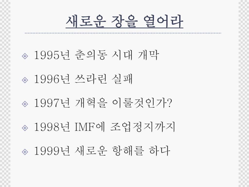 새로운 장을 열어라 • 1995년 춘의동 시대 개막 • 1996년 쓰라린 실패 • 1997년 개혁을 이룰것인가? • 1998년 IMF에 조업정지까지 • 1999년 새로운 항해를 하다