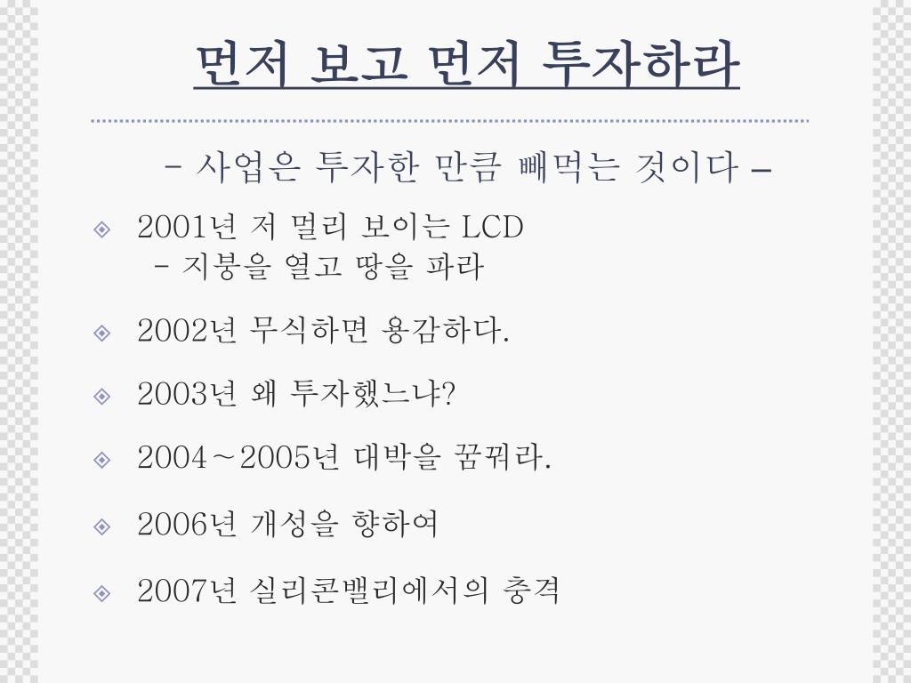 먼저 보고 먼저 투자하라- 사업은 투자한 만큼 빼먹는 것이다 – • 2001년 저 멀리 보이는 LCD - 지붕을 열고 땅을 파라 • 2002년 무식하면 용감하다. • 2003년 왜 투자했느냐? • 2004∼2005년 대박을 꿈꿔라. • 2006년 개성을 향하여 • 2007년 실리콘밸리에서의 충격