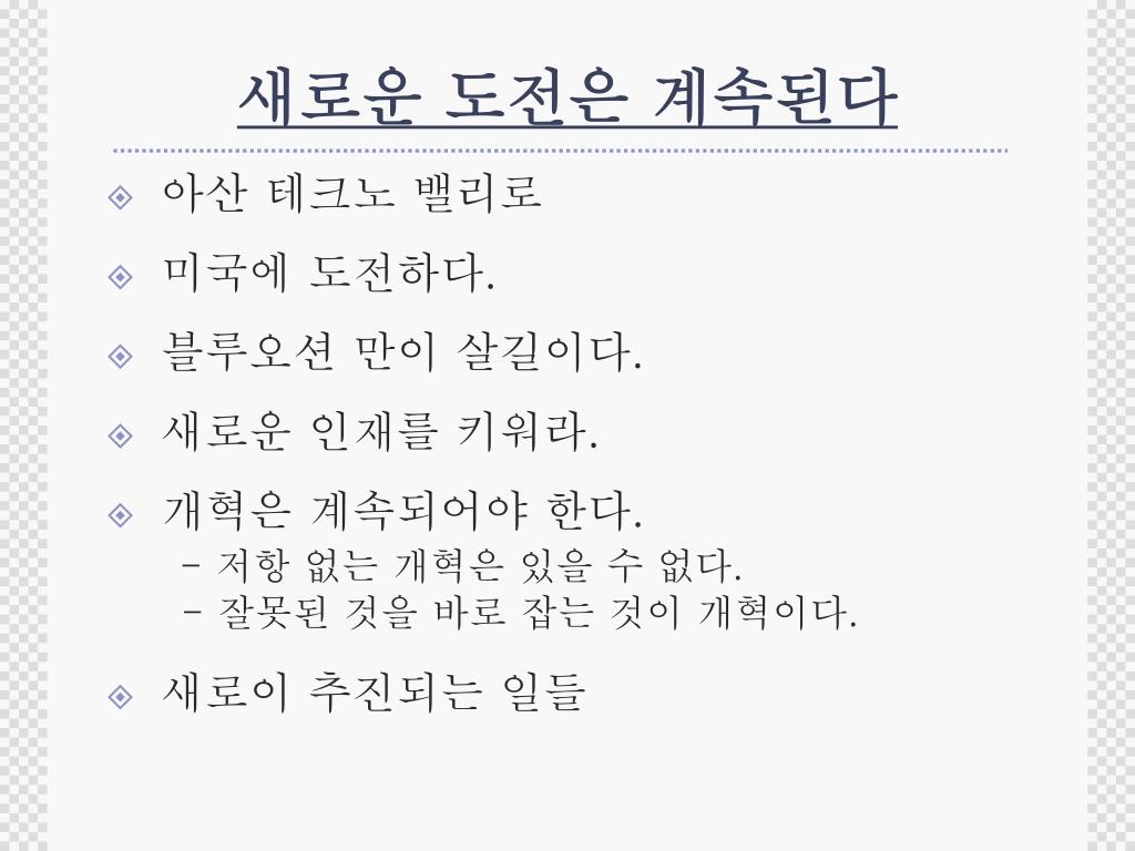 새로운 도전은 계속된다 • 아산 테크노 밸리로 • 미국에 도전하다. • 블루오션 만이 살길이다. • 새로운 인재를 키워라. • 개혁은 계속되어야 한다. - 저항 없는 개혁은 있을 수 없다. - 잘못된 것을 바로 잡는 것이 개혁이다. • 새로이 추진되는 일들