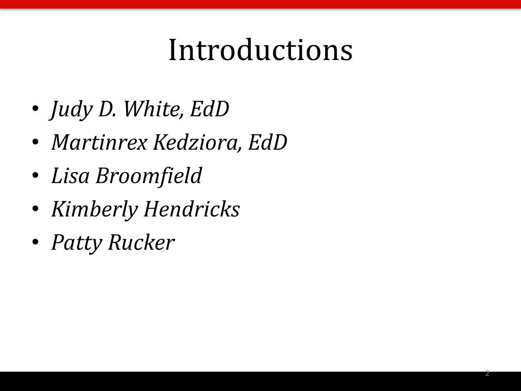 Introductions • Judy D. White, EdD • Martinrex Kedziora, EdD • Lisa Broomfield • Kimberly Hendricks • Patty Rucker