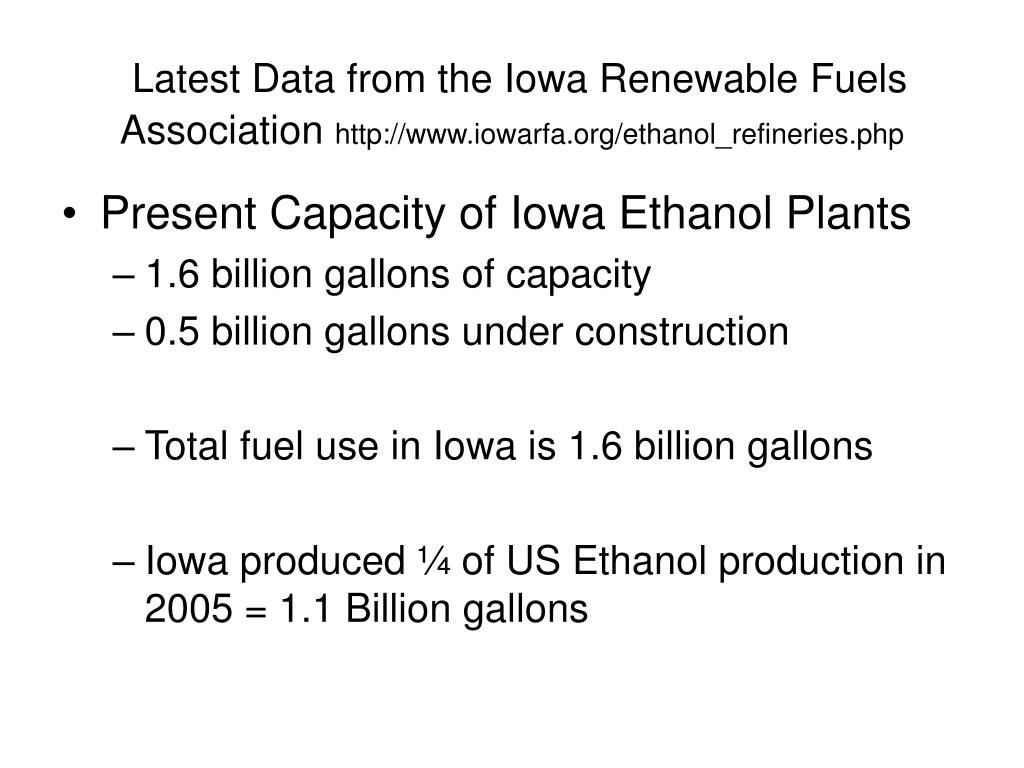Latest Data from the Iowa Renewable Fuels Association http://www.iowarfa.org/ethanol_refineries.php • Present Capacity of Iowa Ethanol Plants • 1.6 billion gallons of capacity • 0.5 billion gallons under construction • Total fuel use in Iowa is 1.6 billion gallons • Iowa produced ¼ of US Ethanol production in 2005 = 1.1 Billion gallons