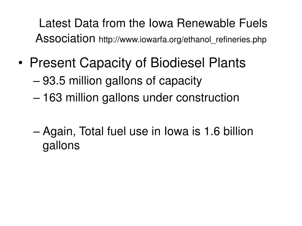 Latest Data from the Iowa Renewable Fuels Association http://www.iowarfa.org/ethanol_refineries.php • Present Capacity of Biodiesel Plants • 93.5 million gallons of capacity • 163 million gallons under construction • Again, Total fuel use in Iowa is 1.6 billion gallons