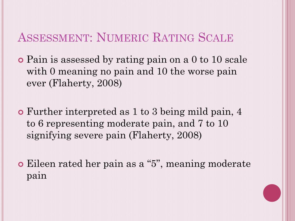 Assessment: Numeric Rating Scale • Pain is assessed by rating pain on a 0 to 10 scale with 0 meaning no pain and 10 the worse pain ever (Flaherty, 2008) • Further interpreted as 1 to 3 being mild pain, 4 to 6 representing moderate pain, and 7 to 10 signifying severe pain (Flaherty, 2008) • Eileen rated her pain as a “5”, meaning moderate pain