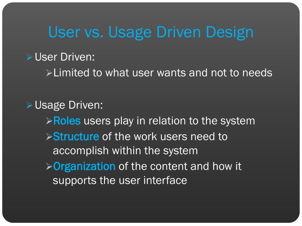 User vs. Usage Driven Design • User Driven: • Limited to what user wants and not to needs • Usage Driven: • Roles users play in relation to the system • Structure of the work users need to accomplish within the system • Organization of the content and how it supports the user interface