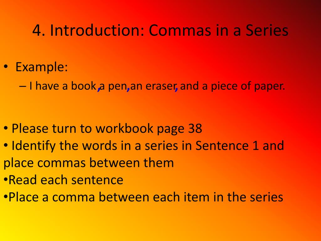 4. Introduction: Commas in a Series • Example: • I have a book a pen an eraser and a piece of paper. , , , • Please turn to workbook page 38 • Identify the words in a series in Sentence 1 and place commas between them • Read each sentence • Place a comma between each item in the series