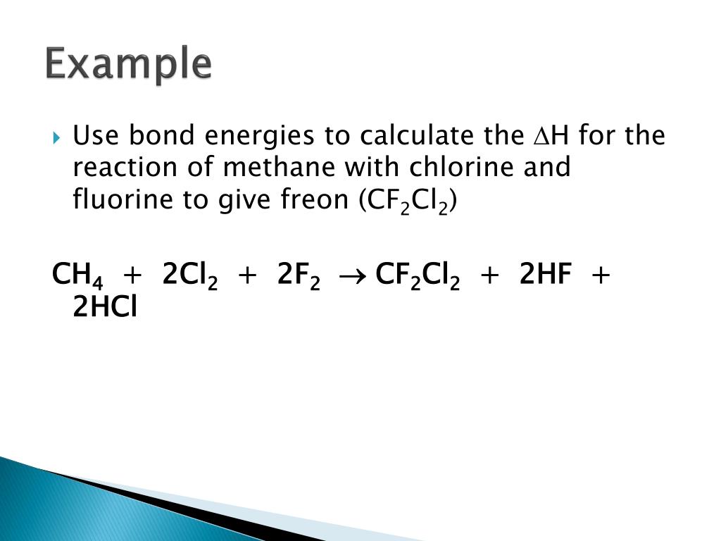 Example • Use bond energies to calculate the H for the reaction of methane with chlorine and fluorine to give freon (CF2Cl2) CH4 + 2Cl2 + 2F2 CF2Cl2 + 2HF + 2HCl