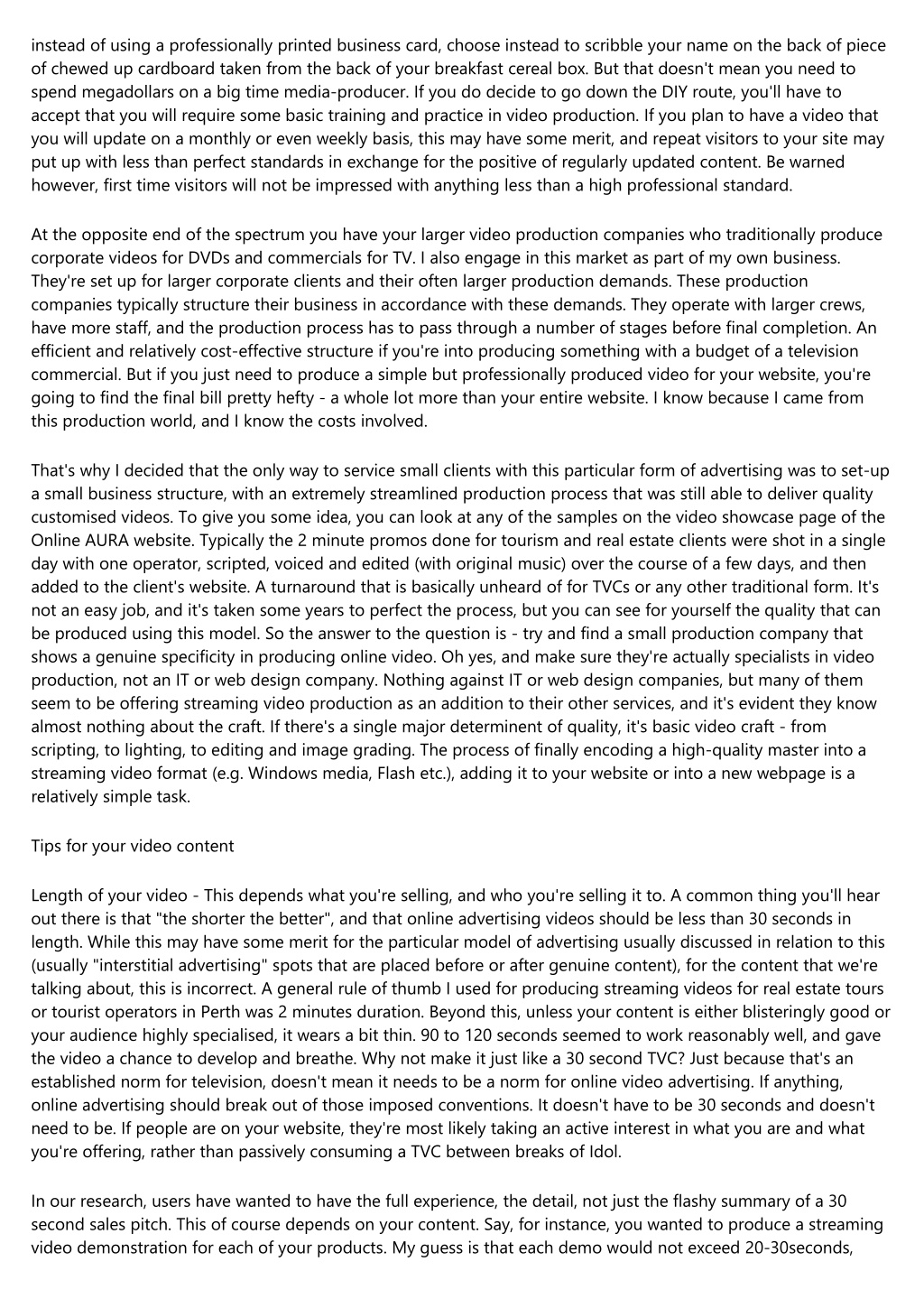 instead of using a professionally printed business card, choose instead to scribble your name on the back of piece of chewed up cardboard taken from the back of your breakfast cereal box. But that doesn't mean you need to spend megadollars on a big time media-producer. If you do decide to go down the DIY route, you'll have to accept that you will require some basic training and practice in video production. If you plan to have a video that you will update on a monthly or even weekly basis, this may have some merit, and repeat visitors to your site may put up with less than perfect standards in exchange for the positive of regularly updated content. Be warned however, first time visitors will not be impressed with anything less than a high professional standard. At the opposite end of the spectrum you have your larger video production companies who traditionally produce corporate videos for DVDs and commercials for TV. I also engage in this market as part of my own business. They're set up for larger corporate clients and their often larger production demands. These production companies typically structure their business in accordance with these demands. They operate with larger crews, have more staff, and the production process has to pass through a number of stages before final completion. An efficient and relatively cost-effective structure if you're into producing something with a budget of a television commercial. But if you just need to produce a simple but professionally produced video for your website, you're going to find the final bill pretty hefty - a whole lot more than your entire website. I know because I came from this production world, and I know the costs involved. That's why I decided that the only way to service small clients with this particular form of advertising was to set-up a small business structure, with an extremely streamlined production process that was still able to deliver quality customised videos. To give you some idea, you can look at any of the samples on the video showcase page of the Online AURA website. Typically the 2 minute promos done for tourism and real estate clients were shot in a single day with one operator, scripted, voiced and edited (with original music) over the course of a few days, and then added to the client's website. A turnaround that is basically unheard of for TVCs or any other traditional form. It's not an easy job, and it's taken some years to perfect the process, but you can see for yourself the quality that can be produced using this model. So the answer to the question is - try and find a small production company that shows a genuine specificity in producing online video. Oh yes, and make sure they're actually specialists in video production, not an IT or web design company. Nothing against IT or web design companies, but many of them seem to be offering streaming video production as an addition to their other services, and it's evident they know almost nothing about the craft. If there's a single major determinent of quality, it's basic video craft - from scripting, to lighting, to editing and image grading. The process of finally encoding a high-quality master into a streaming video format (e.g. Windows media, Flash etc.), adding it to your website or into a new webpage is a relatively simple task. Tips for your video content Length of your video - This depends what you're selling, and who you're selling it to. A common thing you'll hear out there is that "the shorter the better", and that online advertising videos should be less than 30 seconds in length. While this may have some merit for the particular model of advertising usually discussed in relation to this (usually "interstitial advertising" spots that are placed before or after genuine content), for the content that we're talking about, this is incorrect. A general rule of thumb I used for producing streaming videos for real estate tours or tourist operators in Perth was 2 minutes duration. Beyond this, unless your content is either blisteringly good or your audience highly specialised, it wears a bit thin. 90 to 120 seconds seemed to work reasonably well, and gave the video a chance to develop and breathe. Why not make it just like a 30 second TVC? Just because that's an established norm for television, doesn't mean it needs to be a norm for online video advertising. If anything, online advertising should break out of those imposed conventions. It doesn't have to be 30 seconds and doesn't need to be. If people are on your website, they're most likely taking an active interest in what you are and what you're offering, rather than passively consuming a TVC between breaks of Idol. In our research, users have wanted to have the full experience, the detail, not just the flashy summary of a 30 second sales pitch. This of course depends on your content. Say, for instance, you wanted to produce a streaming video demonstration for each of your products. My guess is that each demo would not exceed 20-30seconds,