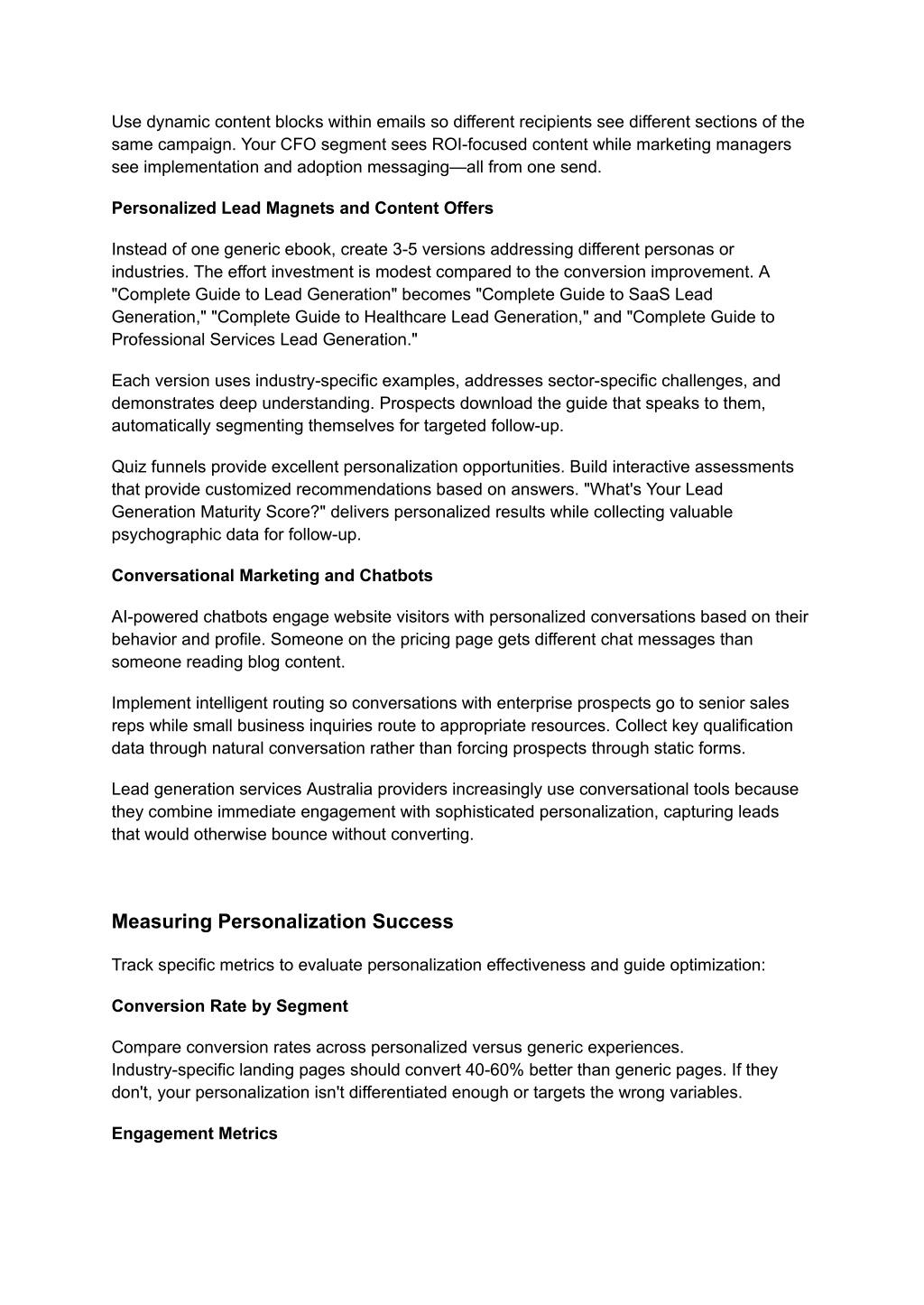 Use dynamic content blocks within emails so different recipients see different sections of the same campaign. Your CFO segment sees ROI-focused content while marketing managers see implementation and adoption messaging—all from one send. Personalized Lead Magnets and Content Offers Instead of one generic ebook, create 3-5 versions addressing different personas or industries. The effort investment is modest compared to the conversion improvement. A "Complete Guide to Lead Generation" becomes "Complete Guide to SaaS Lead Generation," "Complete Guide to Healthcare Lead Generation," and "Complete Guide to Professional Services Lead Generation." Each version uses industry-specific examples, addresses sector-specific challenges, and demonstrates deep understanding. Prospects download the guide that speaks to them, automatically segmenting themselves for targeted follow-up. Quiz funnels provide excellent personalization opportunities. Build interactive assessments that provide customized recommendations based on answers. "What's Your Lead Generation Maturity Score?" delivers personalized results while collecting valuable psychographic data for follow-up. Conversational Marketing and Chatbots AI-powered chatbots engage website visitors with personalized conversations based on their behavior and profile. Someone on the pricing page gets different chat messages than someone reading blog content. Implement intelligent routing so conversations with enterprise prospects go to senior sales reps while small business inquiries route to appropriate resources. Collect key qualification data through natural conversation rather than forcing prospects through static forms. Lead generation services Australia providers increasingly use conversational tools because they combine immediate engagement with sophisticated personalization, capturing leads that would otherwise bounce without converting. Measuring Personalization Success Track specific metrics to evaluate personalization effectiveness and guide optimization: Conversion Rate by Segment Compare conversion rates across personalized versus generic experiences. Industry-specific landing pages should convert 40-60% better than generic pages. If they don't, your personalization isn't differentiated enough or targets the wrong variables. Engagement Metrics