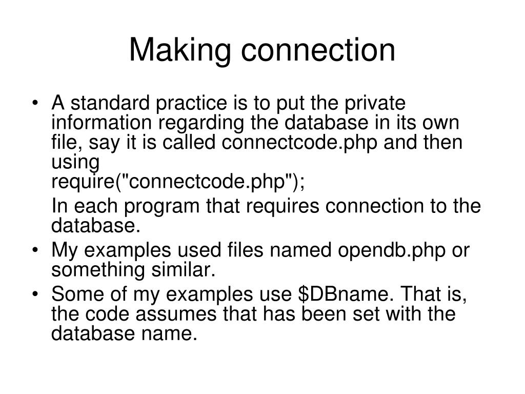 Making connection • A standard practice is to put the private information regarding the database in its own file, say it is called connectcode.php and then using require("connectcode.php"); In each program that requires connection to the database. • My examples used files named opendb.php or something similar. • Some of my examples use $DBname. That is, the code assumes that has been set with the database name.