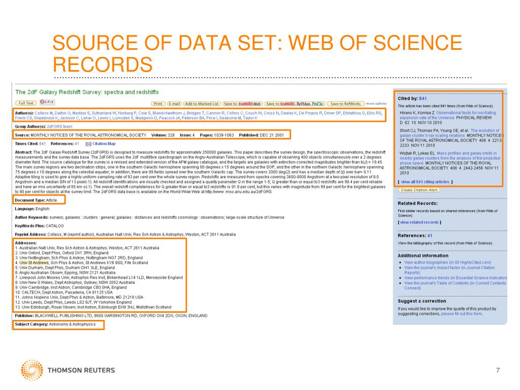 Thomson Reuters value added metrics Basic bibliographic information about the article (including the field) Number of citations The Journal Impact Factor from the latest edition of the Journal Citation Reports