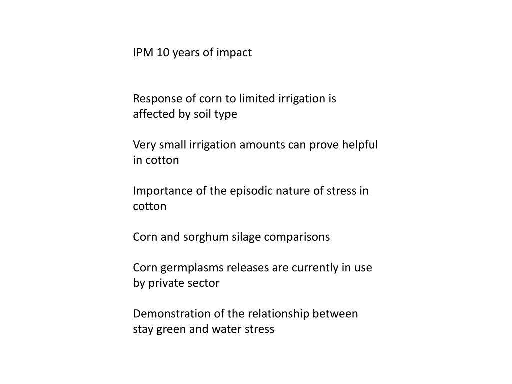 IPM 10 years of impact Response of corn to limited irrigation is affected by soil type Very small irrigation amounts can prove helpful in cotton Importance of the episodic nature of stress in cotton Corn and sorghum silage comparisons Corn germplasms releases are currently in use by private sector Demonstration of the relationship between stay green and water stress