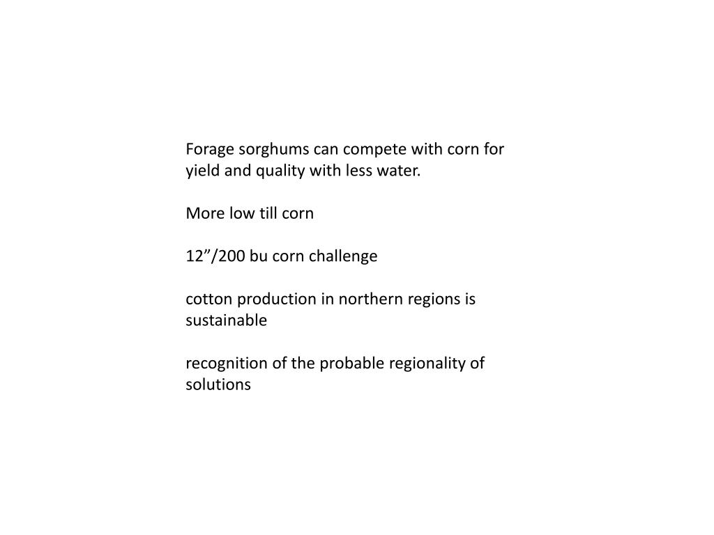 Forage sorghums can compete with corn for yield and quality with less water. More low till corn 12”/200 bu corn challenge cotton production in northern regions is sustainable recognition of the probable regionality of solutions