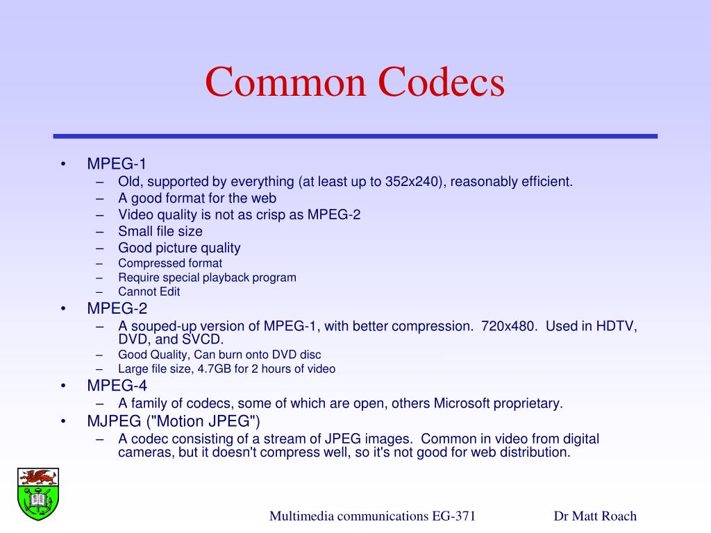 Common Codecs • MPEG-1 • Old, supported by everything (at least up to 352x240), reasonably efficient. • A good format for the web • Video quality is not as crisp as MPEG-2 • Small file size • Good picture quality • Compressed format • Require special playback program • Cannot Edit • MPEG-2 • A souped-up version of MPEG-1, with better compression. 720x480. Used in HDTV, DVD, and SVCD. • Good Quality, Can burn onto DVD disc • Large file size, 4.7GB for 2 hours of video • MPEG-4 • A family of codecs, some of which are open, others Microsoft proprietary. • MJPEG ("Motion JPEG") • A codec consisting of a stream of JPEG images. Common in video from digital cameras, but it doesn't compress well, so it's not good for web distribution. Multimedia communications EG-371 Dr Matt Roach