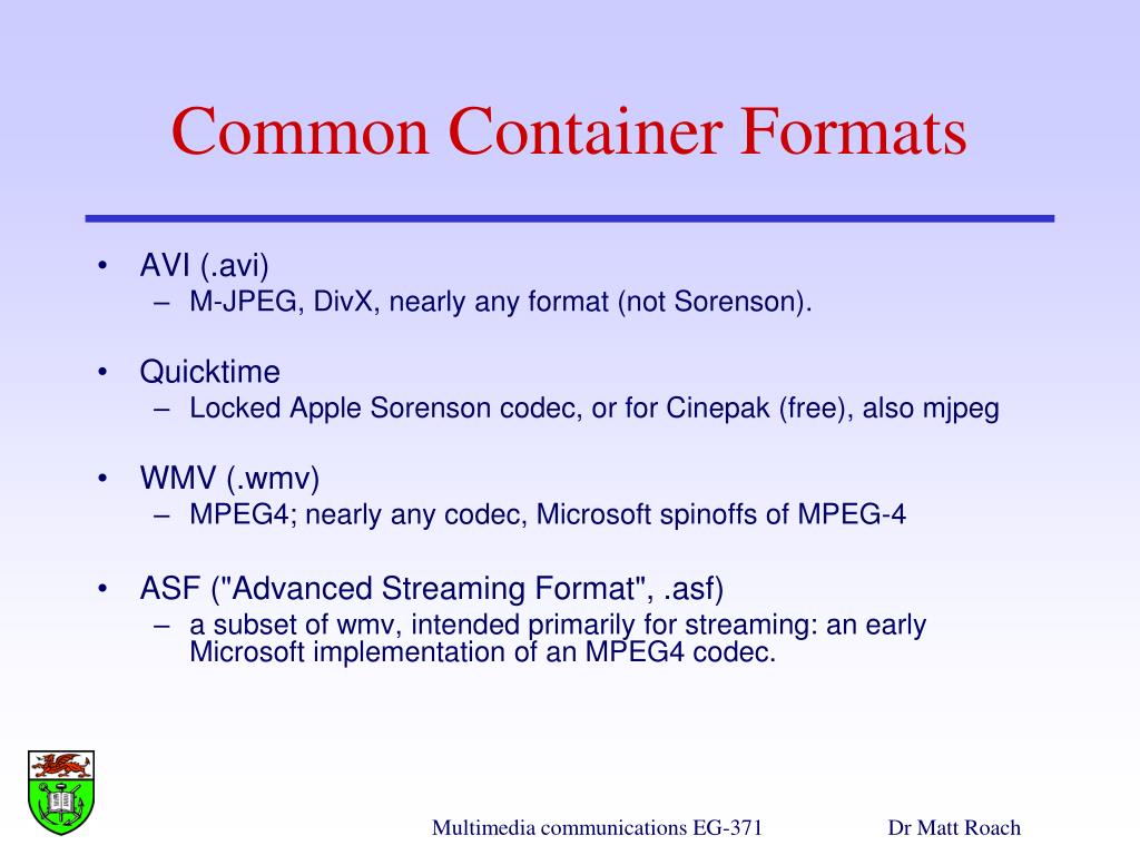 Common Container Formats • AVI (.avi) • M-JPEG, DivX, nearly any format (not Sorenson). • Quicktime • Locked Apple Sorenson codec, or for Cinepak (free), also mjpeg • WMV (.wmv) • MPEG4; nearly any codec, Microsoft spinoffs of MPEG-4 • ASF ("Advanced Streaming Format", .asf) • a subset of wmv, intended primarily for streaming: an early Microsoft implementation of an MPEG4 codec. Multimedia communications EG-371 Dr Matt Roach