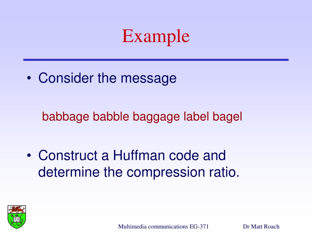 Example • Consider the message babbage babble baggage label bagel • Construct a Huffman code and determine the compression ratio. Multimedia communications EG-371 Dr Matt Roach
