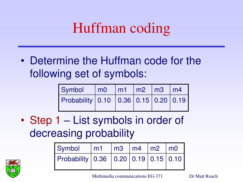 Huffman coding • Determine the Huffman code for the following set of symbols: • Step 1 – List symbols in order of decreasing probability Multimedia communications EG-371 Dr Matt Roach