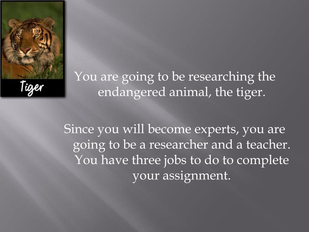 You are going to be researching the endangered animal, the tiger. Since you will become experts, you are going to be a researcher and a teacher. You have three jobs to do to complete your assignment.