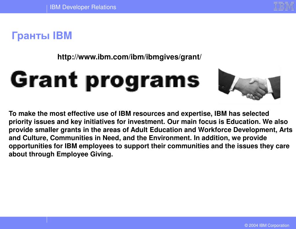 Гранты IBM http://www.ibm.com/ibm/ibmgives/grant/ To make the most effective use of IBM resources and expertise, IBM has selected priority issues and key initiatives for investment. Our main focus is Education. We also provide smaller grants in the areas of Adult Education and Workforce Development, Arts and Culture, Communities in Need, and the Environment. In addition, we provide opportunities for IBM employees to support their communities and the issues they care about through Employee Giving.