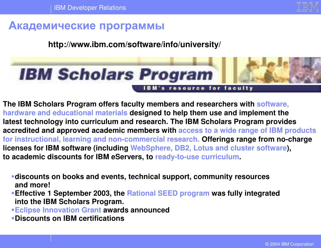 Академические программы http://www.ibm.com/software/info/university/ • discounts on books and events, technical support, community resources and more! • Effective 1 September 2003, the Rational SEED program was fully integrated into the IBM Scholars Program. • Eclipse Innovation Grant awards announced • Discounts on IBM certifications The IBM Scholars Program offers faculty members and researchers with software, hardware and educational materials designed to help them use and implement the latest technology into curriculum and research. The IBM Scholars Program provides accredited and approved academic members with access to a wide range of IBM products for instructional, learning and non-commercial research. Offerings range from no-charge licenses for IBM software (including WebSphere, DB2, Lotus and cluster software), to academic discounts for IBM eServers, to ready-to-use curriculum.
