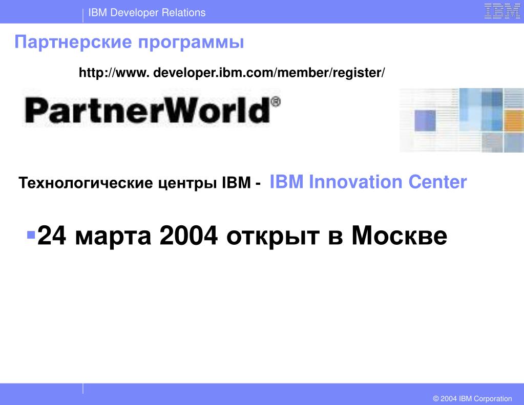 Партнерские программы http://www. developer.ibm.com/member/register/ • 24 марта 2004 открыт в Москве Технологические центры IBM - IBM Innovation Center