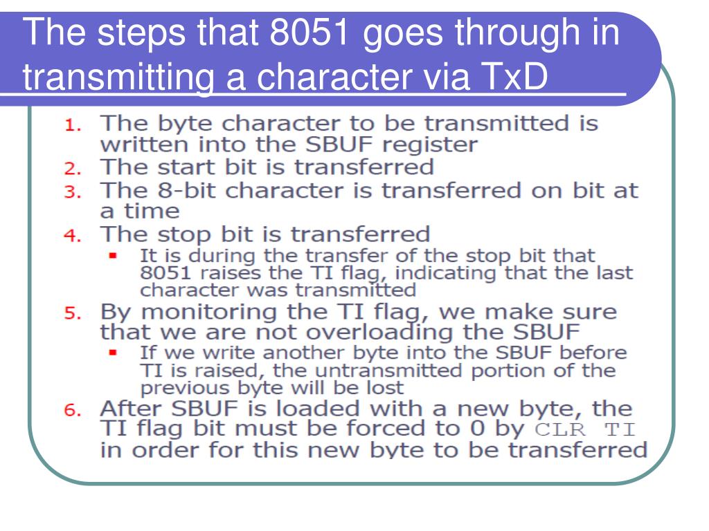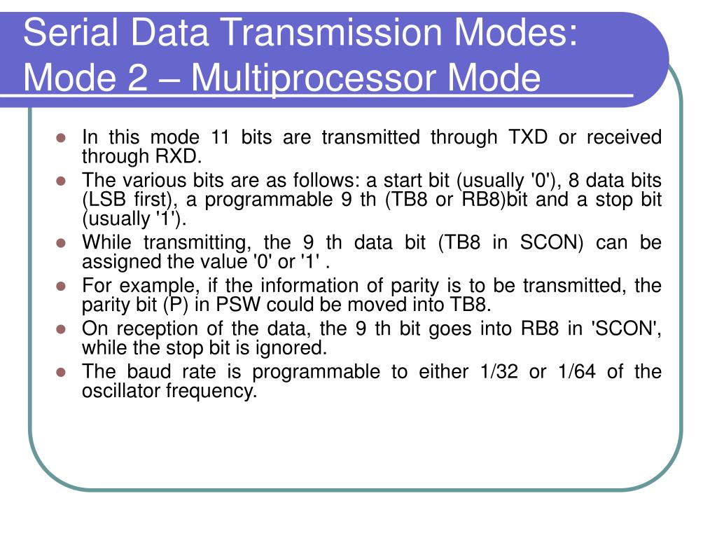 Serial Data Transmission Modes: Mode 2 – Multiprocessor Mode • In this mode 11 bits are transmitted through TXD or received through RXD. • The various bits are as follows: a start bit (usually '0'), 8 data bits (LSB first), a programmable 9 th (TB8 or RB8)bit and a stop bit (usually '1'). • While transmitting, the 9 th data bit (TB8 in SCON) can be assigned the value '0' or '1' . • For example, if the information of parity is to be transmitted, the parity bit (P) in PSW could be moved into TB8. • On reception of the data, the 9 th bit goes into RB8 in 'SCON', while the stop bit is ignored. • The baud rate is programmable to either 1/32 or 1/64 of the oscillator frequency.