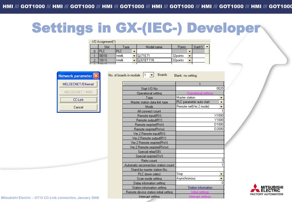 CC-Link connection GT15 (GT15-J61BT13) to System Q (QJ61BT11N). CC-Link connection. OS transfer: communication driver. 1. Select „OS Install -> GOT“. 2. Select „CC-Link Ver.2“ communication driver. 3. Press „Install“. Communication Settings in GT Designer. 1. Select desired channel number.