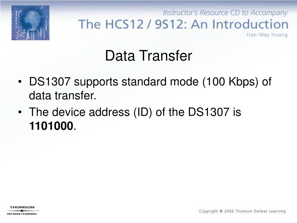 Data Transfer • DS1307 supports standard mode (100 Kbps) of data transfer. • The device address (ID) of the DS1307 is 1101000.